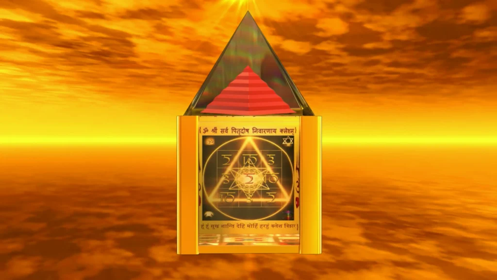These represent the three yonis: Dev Yoni, Yam Yoni, and Manushya Yoni, and address the three types of ancestors: Shant, Ashant, and Shrapit Pitra. It is placed inside a pyramid for protection and energy amplification.